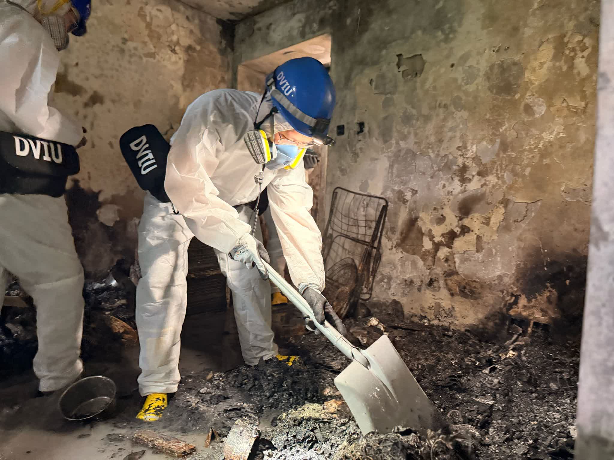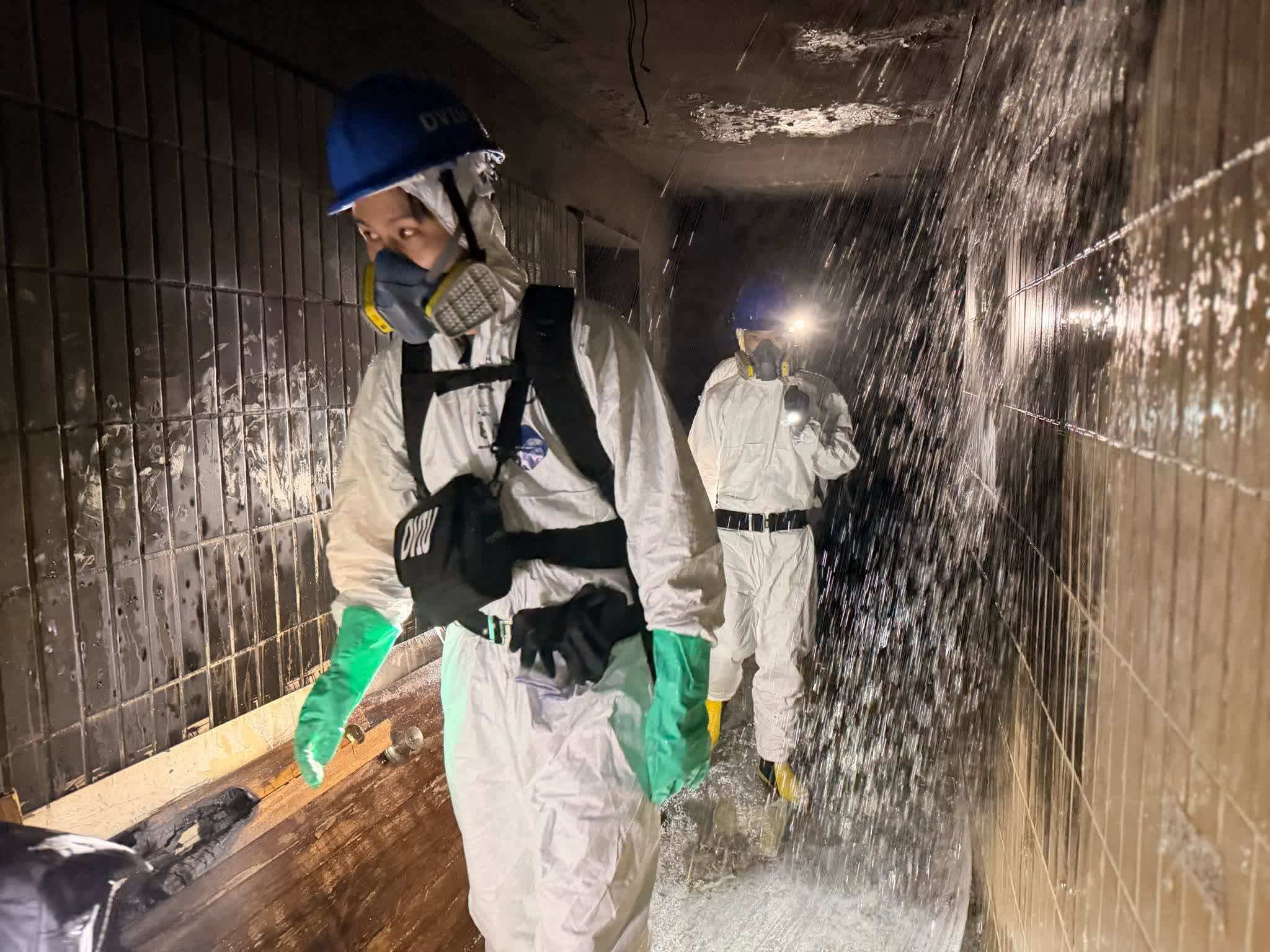 經火災後,現場環境惡劣,外圍有燒毀的竹枝及冷氣機等物品,而大廈内漆黑一片,部分單位水深及小腿,亦有大量家具雜物倒塌。不過,人員仍無畏無懼,團結一致,於現場盡全力搜索能夠辨認到、確認到遇難者身份的任何物件或線索,讓遇難者的家人可以盡早確認他們的身份,讓逝者安息。