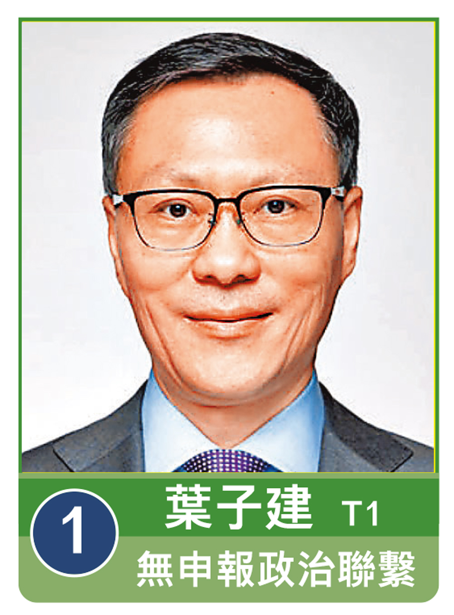 T1號候選人葉子建形容自己是銀行家,在銀行業工作約30年、長期扎根前線,深入了解個人及企業客戶等各行各業的實際需求,同時因曾分管風險管理、財務管理、法律法規等領域,對銀行運營具備全面且深刻的認識。他以「為業界謀發展、為香港添動力」為競選主題,提出將細心聆聽、集思廣益,致力為金融業界爭取政策支持,並把握國家與香港的發展機遇。
