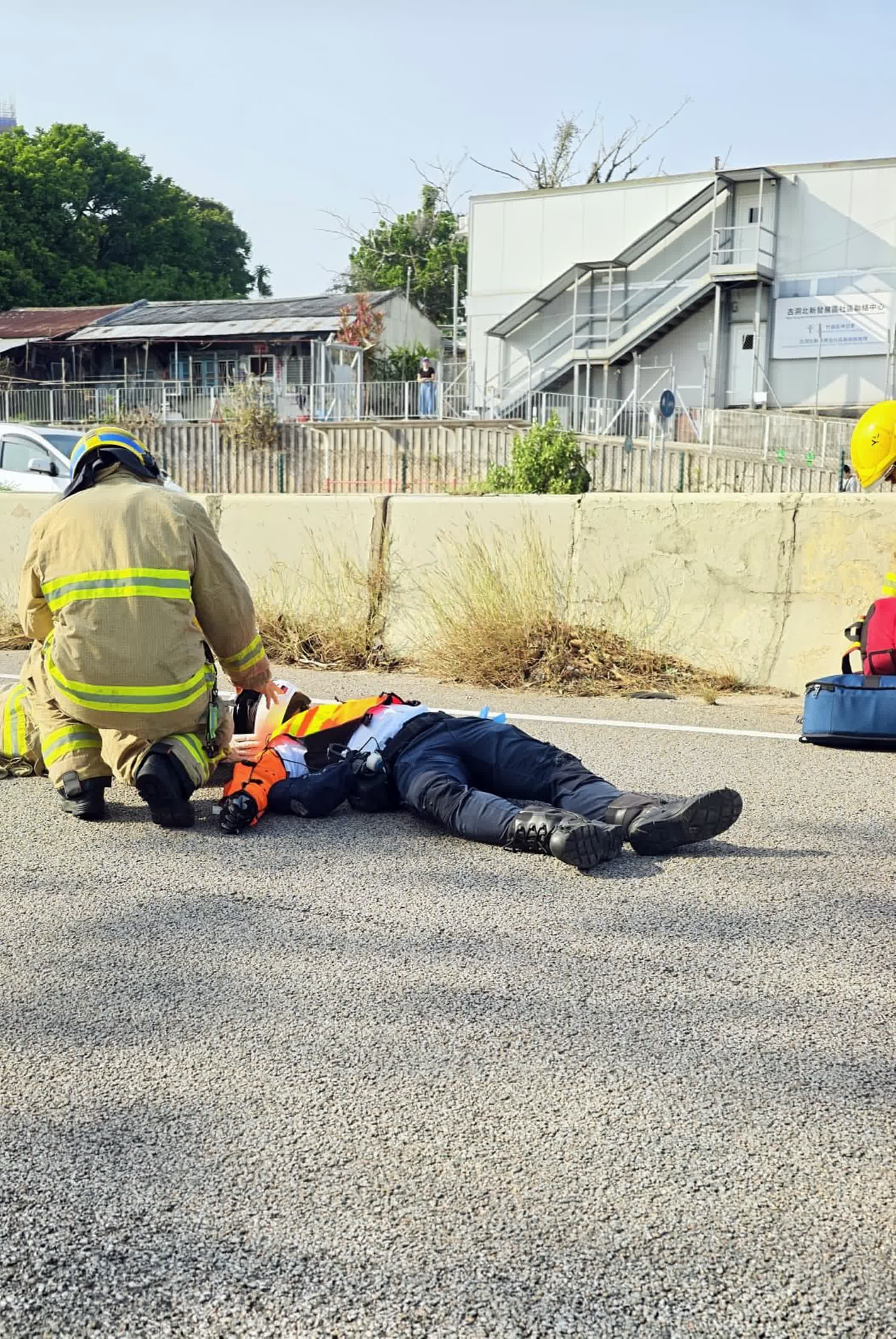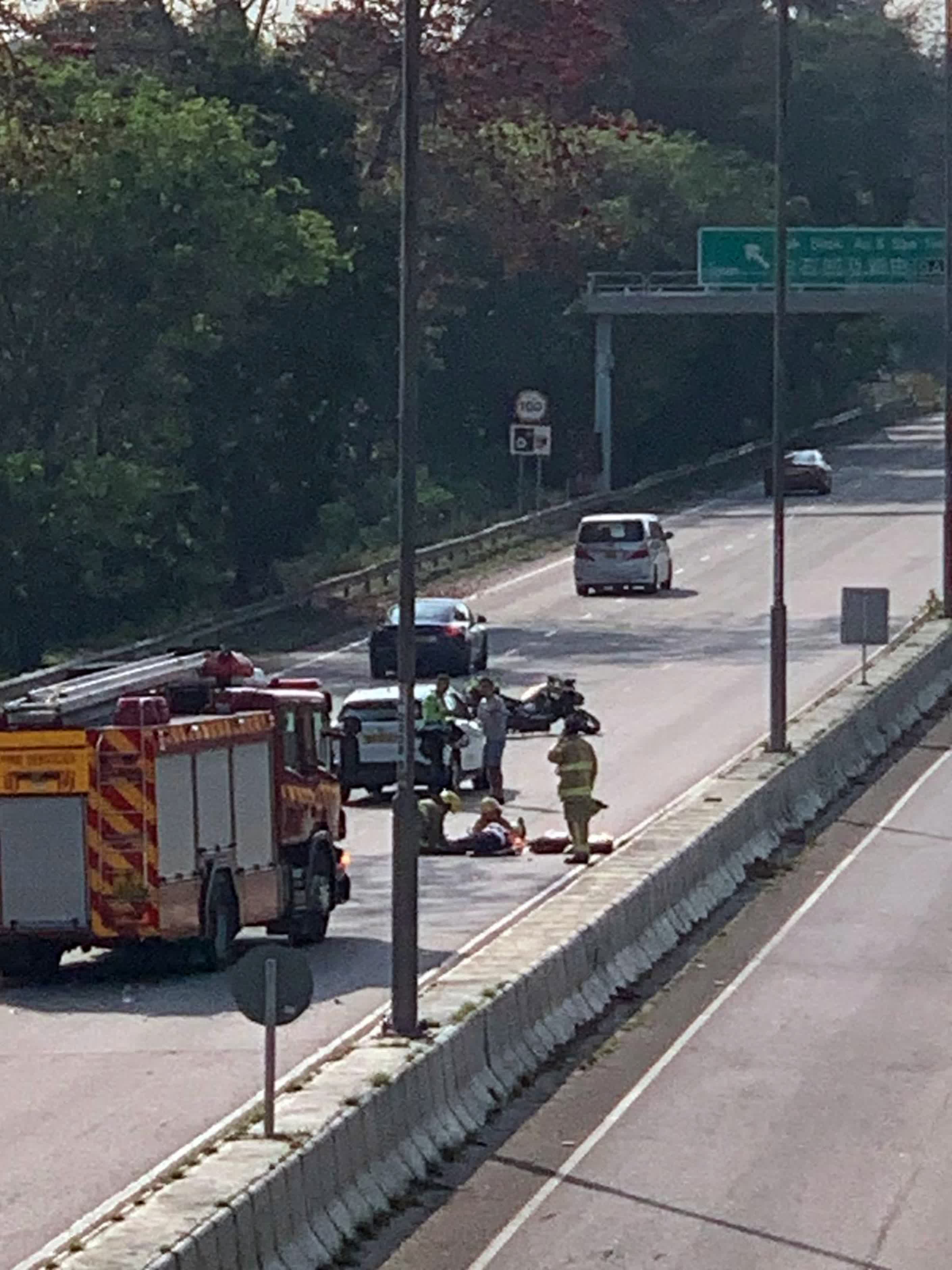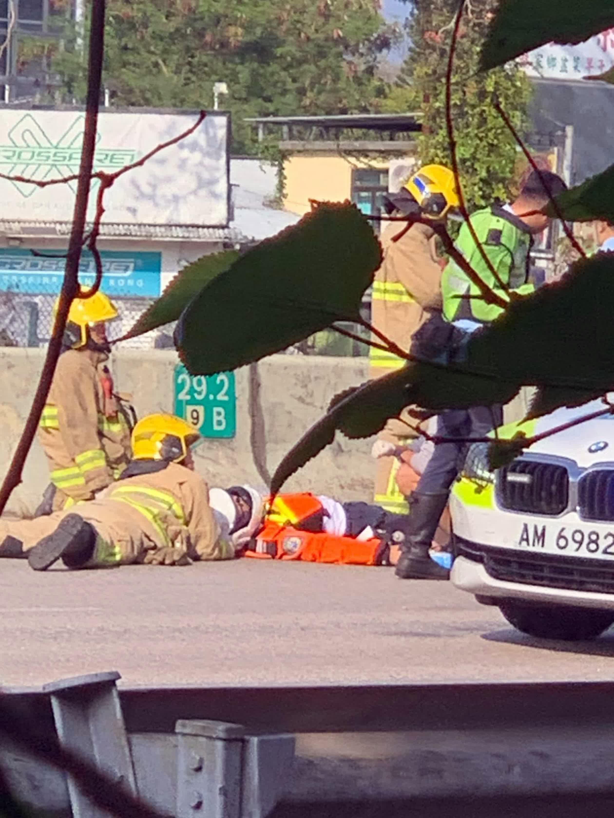 香港文匯報訊(記者 蕭景源)今日下午約4時,一輛救護電單車駛經粉嶺公路往元朗方向近古洞時失事翻側路中快線與中線之間,男司機則倒在地上受傷無法動彈,其他駕駛人士見狀報警,消防及警員到場立即封路救援。由網上圖片可見,有消防員趴在地上檢查涉事救護員傷勢,警方則將現場一毁快線及中線封閉,現場交通繁忙。警方正調查意外原因。