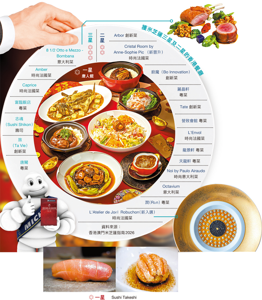 第十八屆《香港澳門米芝蓮指南2026》名單昨日出爐,香港餐飲界於國際評級大放異彩,共77間餐廳奪星,打破去年上榜餐廳紀錄。本年度的指南收錄278間餐廳,涵蓋米芝蓮星級、必比登推介及入選餐廳名單,包括219間香港餐廳及59間澳門餐廳。今年更新增首度於香港及澳門亮相的米芝蓮指南導師主廚大獎,表揚致力傳承烹飪藝術與知識予新一代的大廚。此外,5間餐廳蟬聯米芝蓮綠星,彰顯港澳兩地對未來餐飲的可持續承諾。 ●香港文匯報記者 李芷珊