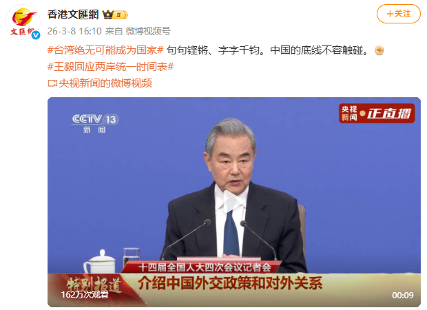 8日上午10時,十四屆全國人大四次會議舉行記者會,邀請中共中央政治局委員、外交部長王毅就「中國外交政策和對外關係」相關問題回答中外記者提問。